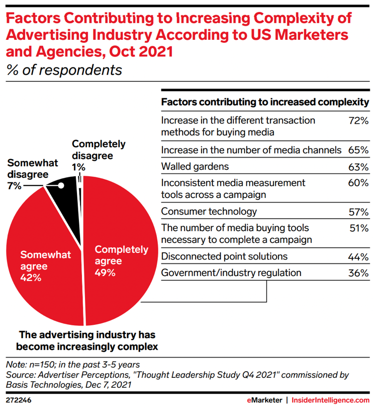 Based on our client work helping CMOs build trust with their audiences, we believe that CMOs who know how to harness their control and influence can have a real impact on their metrics and relationships. This is increasingly hard to do. In a recent report commissioned by Basis Technologies, more than 90% of U.S. marketers agreed on some level that the marketing field is becoming more complex. Respondents cited changes in media buying methods and a growing number of channels having the most impact.