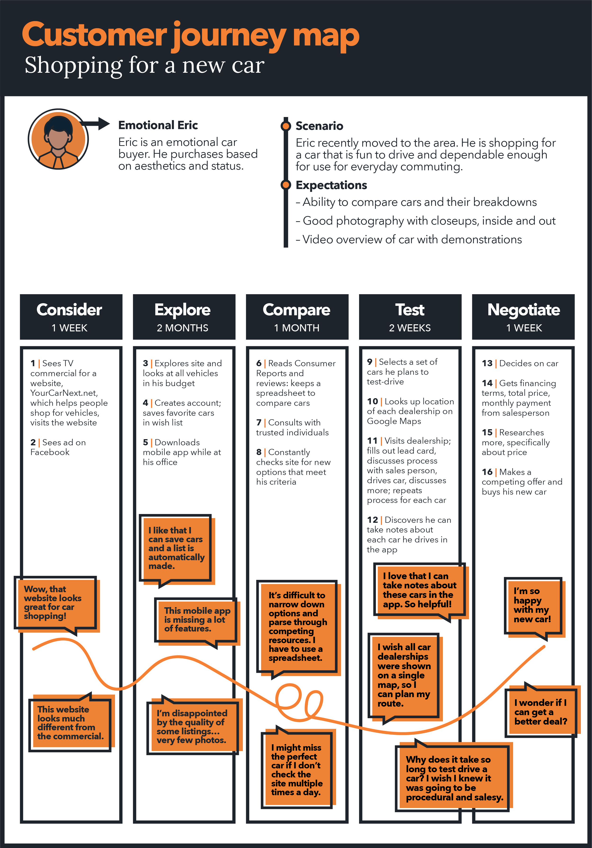 The decision making process is often called a customer journey. We do know that prospects go through a ‘process’ before buying. Understanding that the customer journey is not a linear...step by step process is very important. Prospects can engage with your content in any stage of their journey and in many different channels where they might find your information. It’s important to understand your customer journey but realize that prospects may take many more steps or they may skip steps. For example, the graphic below shows a journey to buying a car. You can see that it’s a pretty involved process but not everyone buys a car this way. In fact, my boss just bought a car. He decided one day that he wanted to buy a car and trade in his truck. He made a phone call, took his truck to the dealership and walked out with a car. He skipped most of the steps in the example below.