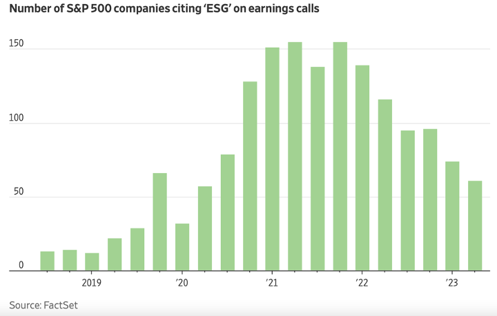 Davos is not the only place where the term ESG has fallen out of favor even as businesses maintain their commitment to ESG (especially the environmental aspect, aka sustainability). According to a January 2024 Wall Street Journal article (fittingly entitled “The Latest Dirty Word in Corporate America: ESG”), 155 companies in the S&P 500 mentioned ESG initiatives in the fourth quarter of 2021, but only 61 did so by the second quarter of 2023.