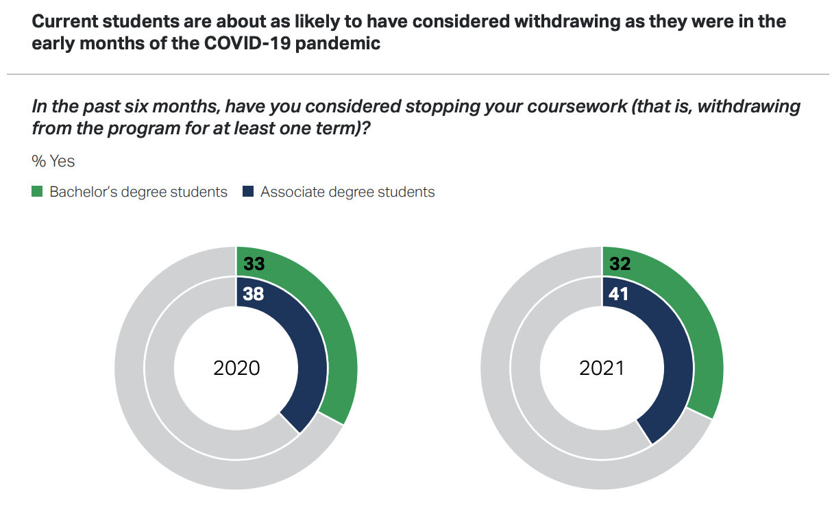 Overall, the percentage of undergraduates who have thought about leaving college is the same as it was when this survey was conducted in 2020 at the height of the COVID-19 pandemic surge that shut down in-person learning.