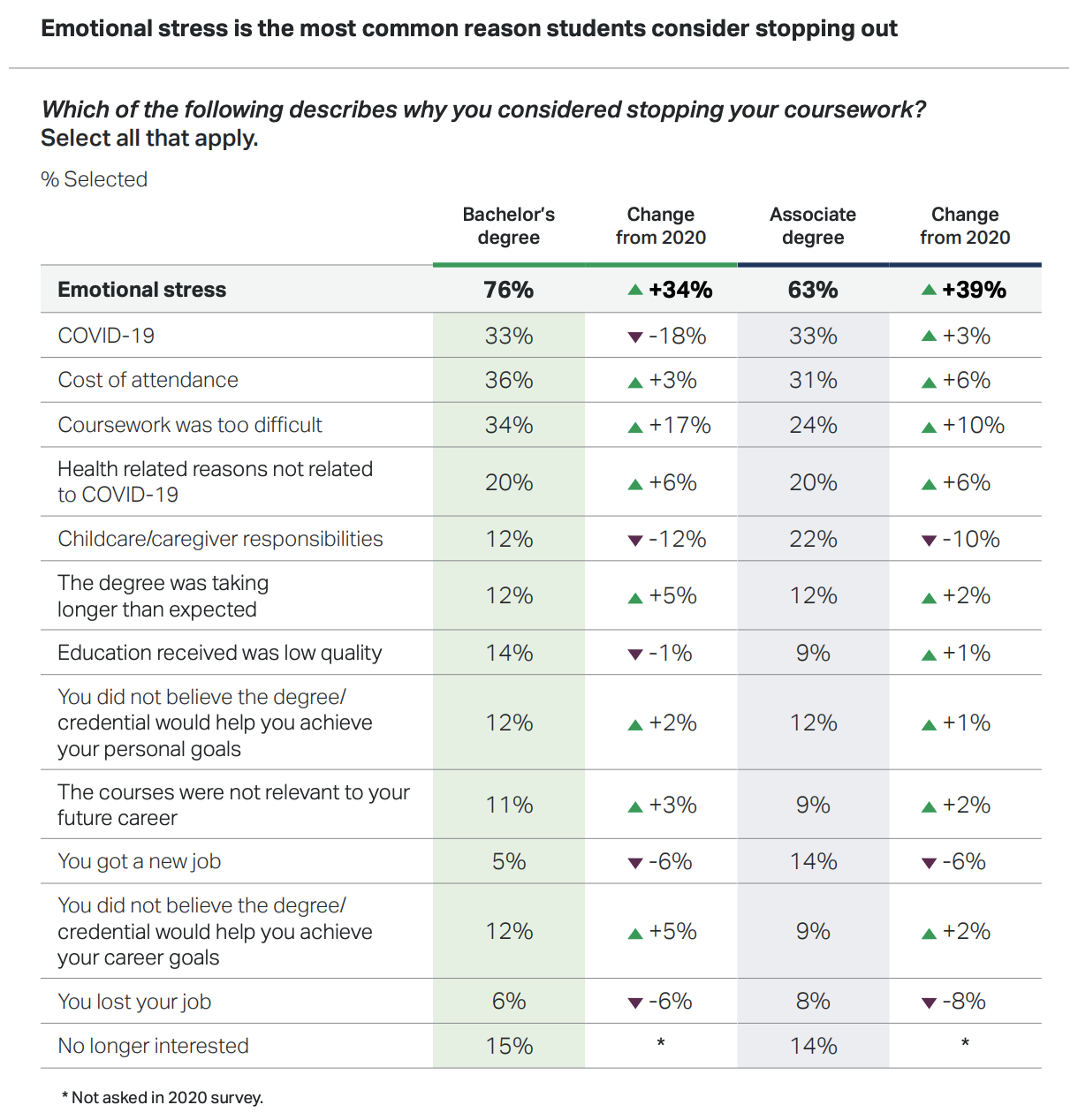 Although COVID-19 is not as strong a factor anymore, emotional stress is becoming more evident: the number of students citing emotional stress as a reason for considering withdrawing from their college jumped 34 percent year over year.