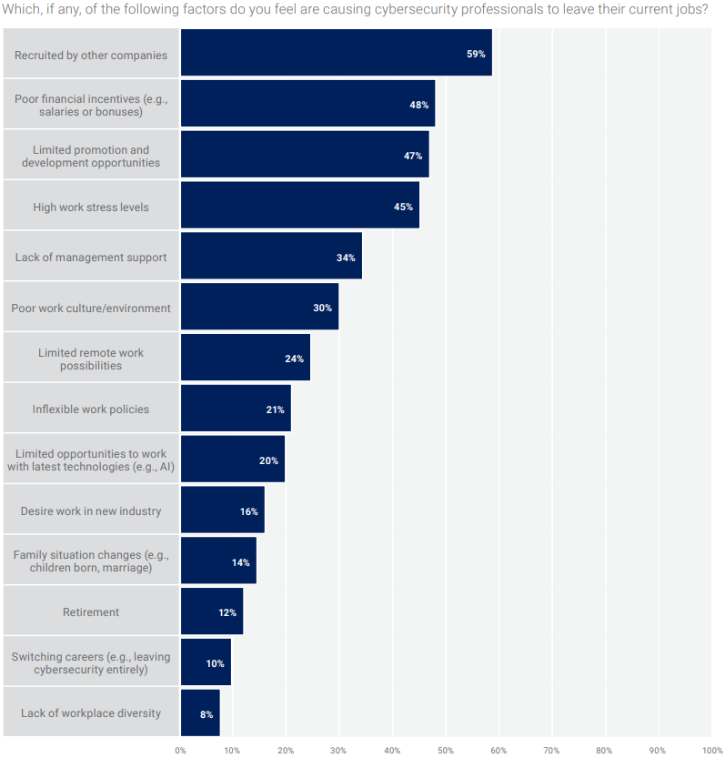 In the same report, 47% of respondents cited a lack of promotion and development opportunities as a top reason a cybersecurity professional might leave their job: