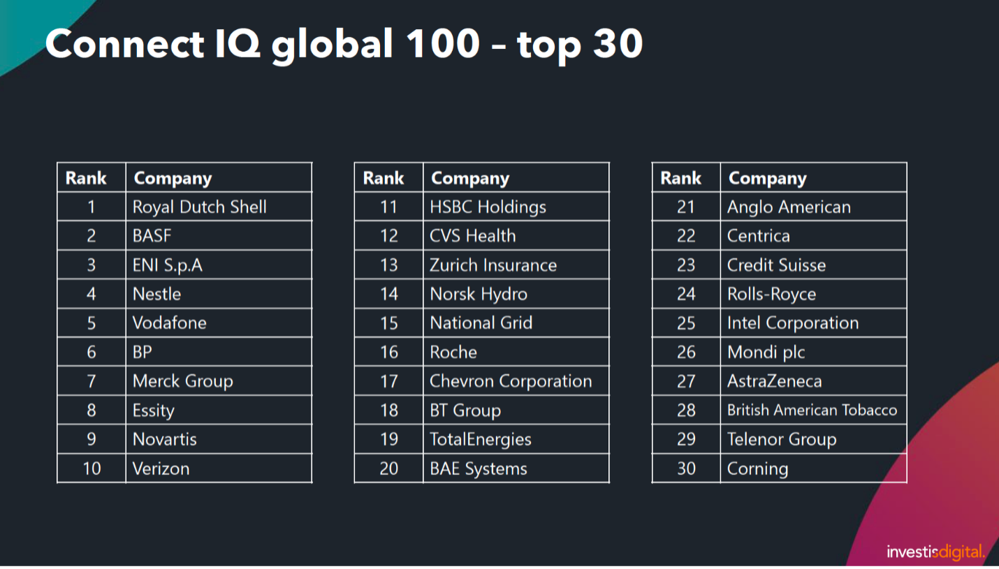 We also benchmark corporate communications online, including websites, using our proprietary Connect.IQ methodology. Connect.IQ features 300 criteria grouped into five categories. In 2021, we benchmarked more than 1,000 corporate websites from the US, UK, Europe and the rest of the world. From there, we put together our Connect.IQ Global 100 – a group of companies across Europe, UK, and US that we think communicate most effectively online through their corporate websites and associated digital channels. Connect.IQ gave me the data I needed to share the following: