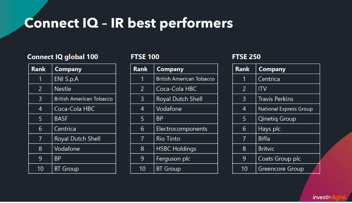 Now, who are the best in class with investor relations outreach? Here are the top performers, cross-indexed against the FTSE 100 and FTSE 250: