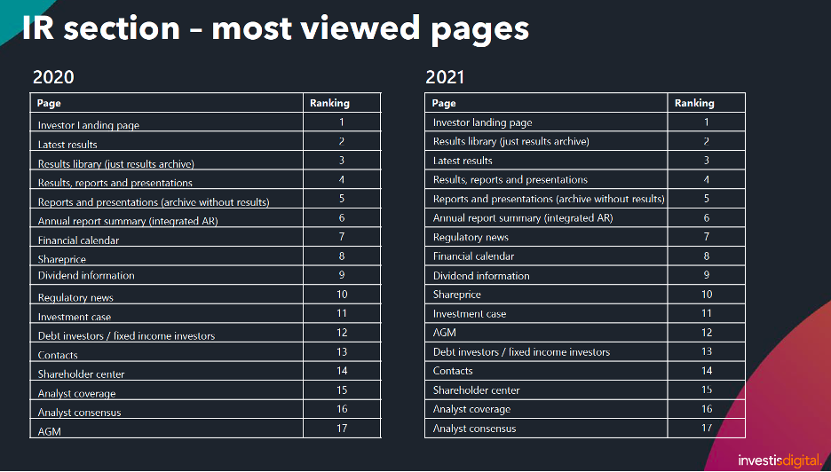 We also took a hard look at what investors are actually looking at within the IR section of businesses’ websites. These are based on the 2,000 corporate and IR sites that we actively managed, and we compare 2021 versus 2020: