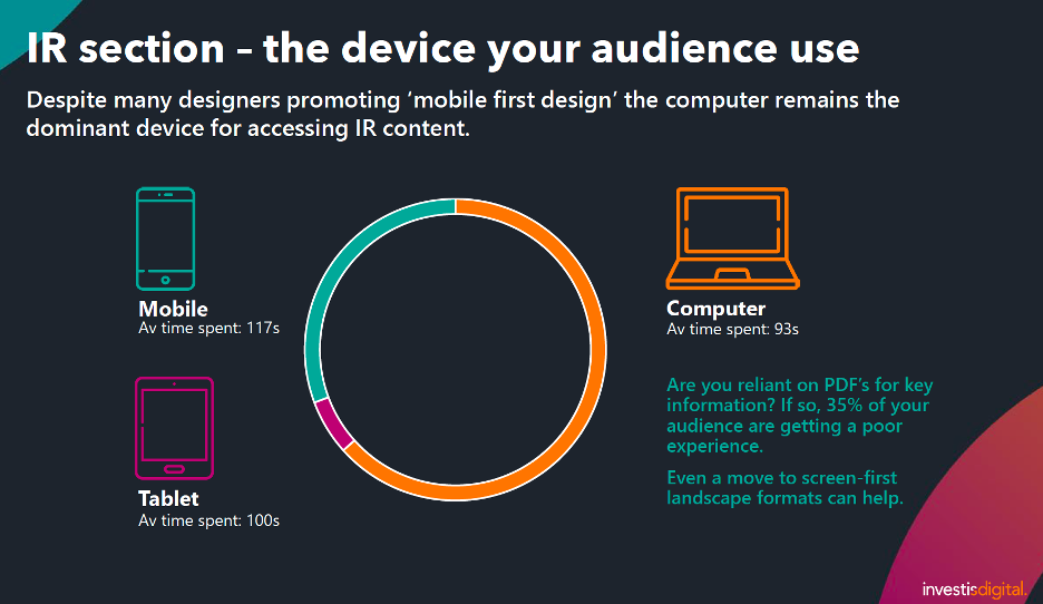 You may have talked with designers who have impressed upon you the need for a mobile-first experience. Well, in reality, for IR audiences, the computer remains the dominant device to access content on the corporate website and the IR site specifically. In fact, around 65 percent of all visits on the IR section were made on a computer. Of course, that means 35 percent of your audience are using a mobile device – generally their phone. This means that if you are using PDFs to deliver key content, you are delivering a poor experience to 35 percent of your audience. We suggest companies rely as little as possible on PDFs for providing crucial content. Where PDFs are necessary, such as your Annual Report, consider using a screen- first landscape format rather than the traditional portrait orientation.