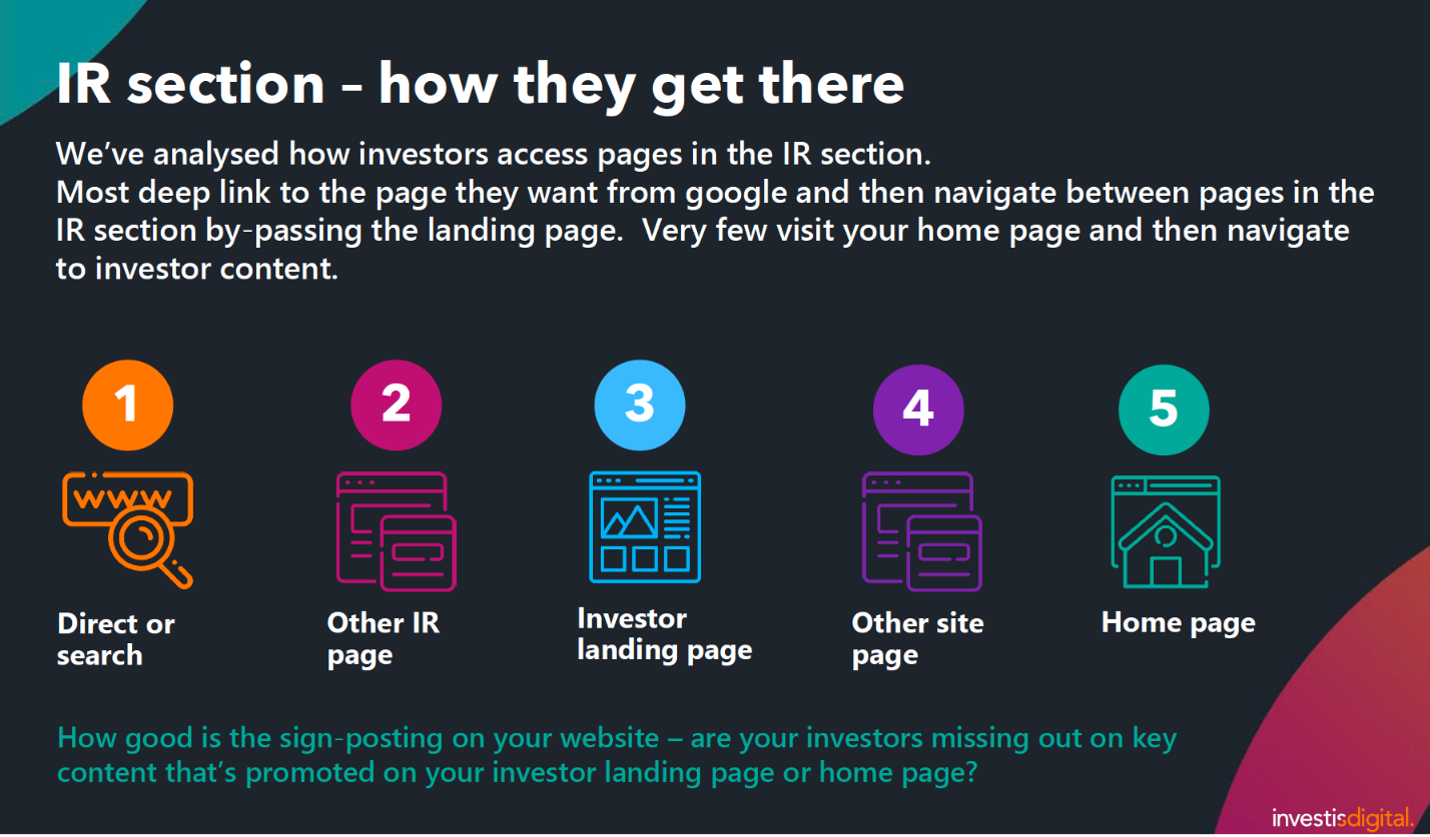 Now, how does your audience arrive at IR content on their devices? How do people get to content within the IR section? Are they coming through the home page and navigating to the IR section? Are they coming through the investor landing page and doing a deep dive into the IR section? The answer to both is a resounding “no”: