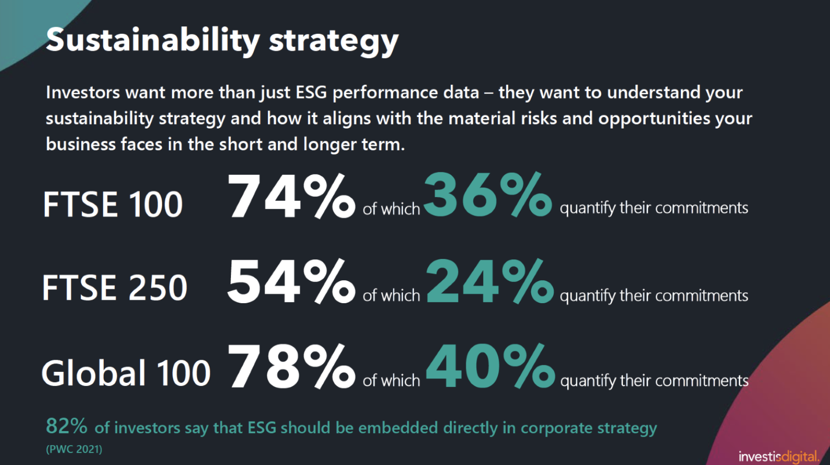 Let’s face it: ESG benchmarks and ratings require a lot of effort to provide data to rating agencies. But they are very important. Almost 70 percent of investors use ESG ratings to make their investing decisions – but less than 50 percent of FTSE 100 provide any narrative or list of benchmarks and ratings they have. This is another area where businesses will need to get better at aligning their content with investor expectations. Being transparent on how your business ranks will resonate at a time when investors need to see more transparency.