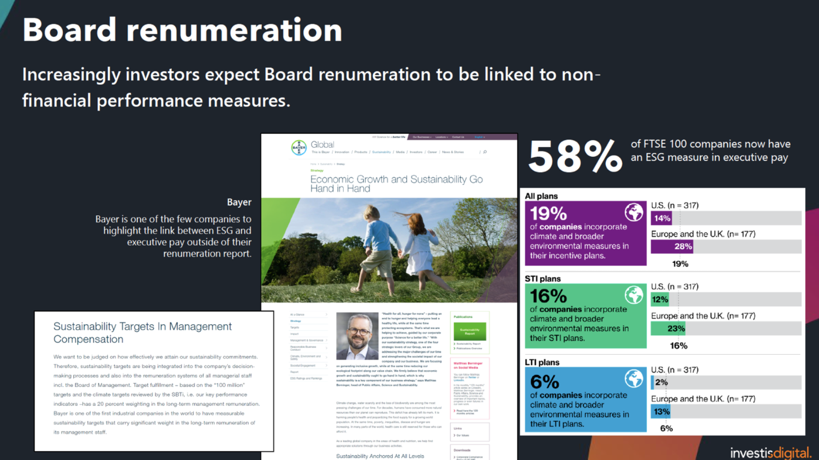 The standout, though, is Bayer. Bayer is one of the few companies to highlight the link between ESG and executive pay outside of their remuneration report. Its ESG strategy landing page connects economic growth, sustainability targets, and compensation. Hats off to Bayer!