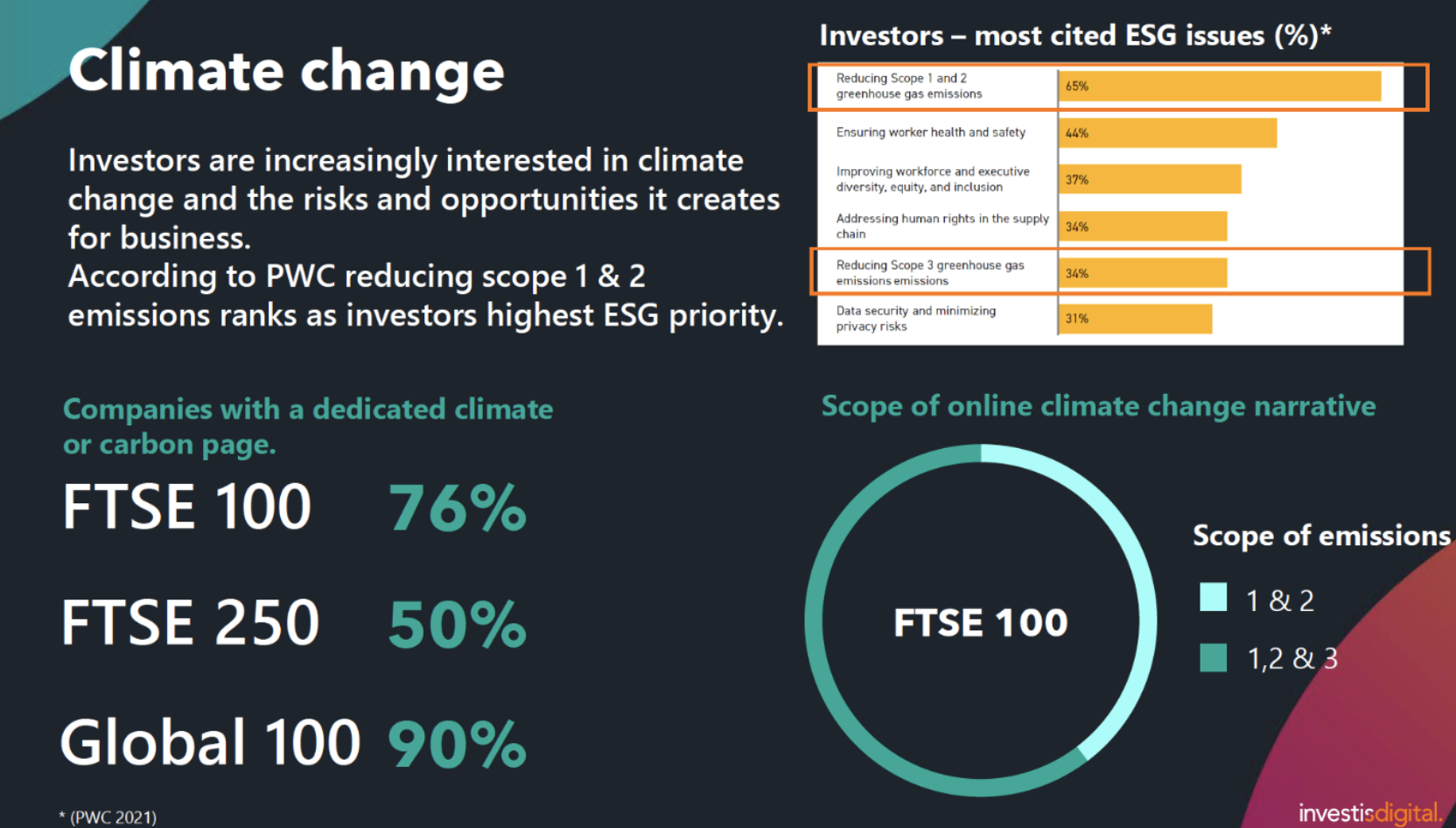 Investors are increasingly interested in climate change and the risks and opportunities it creates for business. According to PWC, reducing scope 1 & 2 emissions ranks as investors’ highest ESG priority, and they are also prioritizing scope 3, supply chain emissions. Most of the FTSE 100 have a dedicated climate or carbon page – but only half of the FTSE 250 do. This situation will change as investors increase the pressure to manage the risk of climate change.