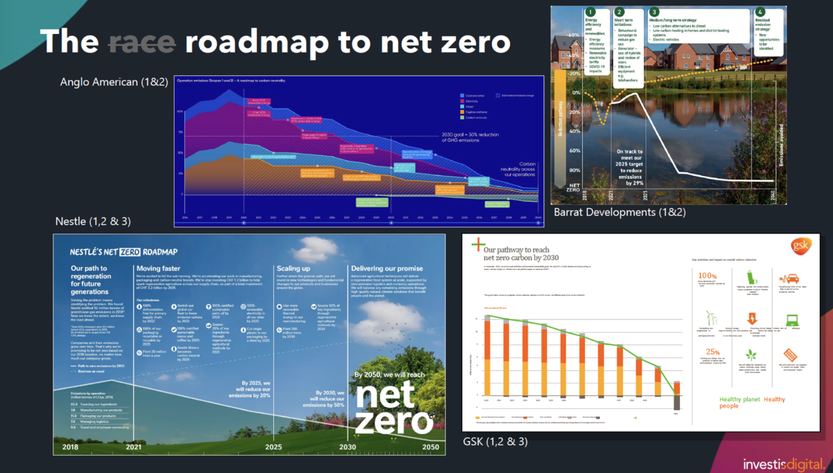 Please visit the websites for Anglo American, Barrat Developments, GSK, and Nestle, all of which provide a mixture of scope 1 and 2 or scope 1, 2, and 3 emission roadmaps.