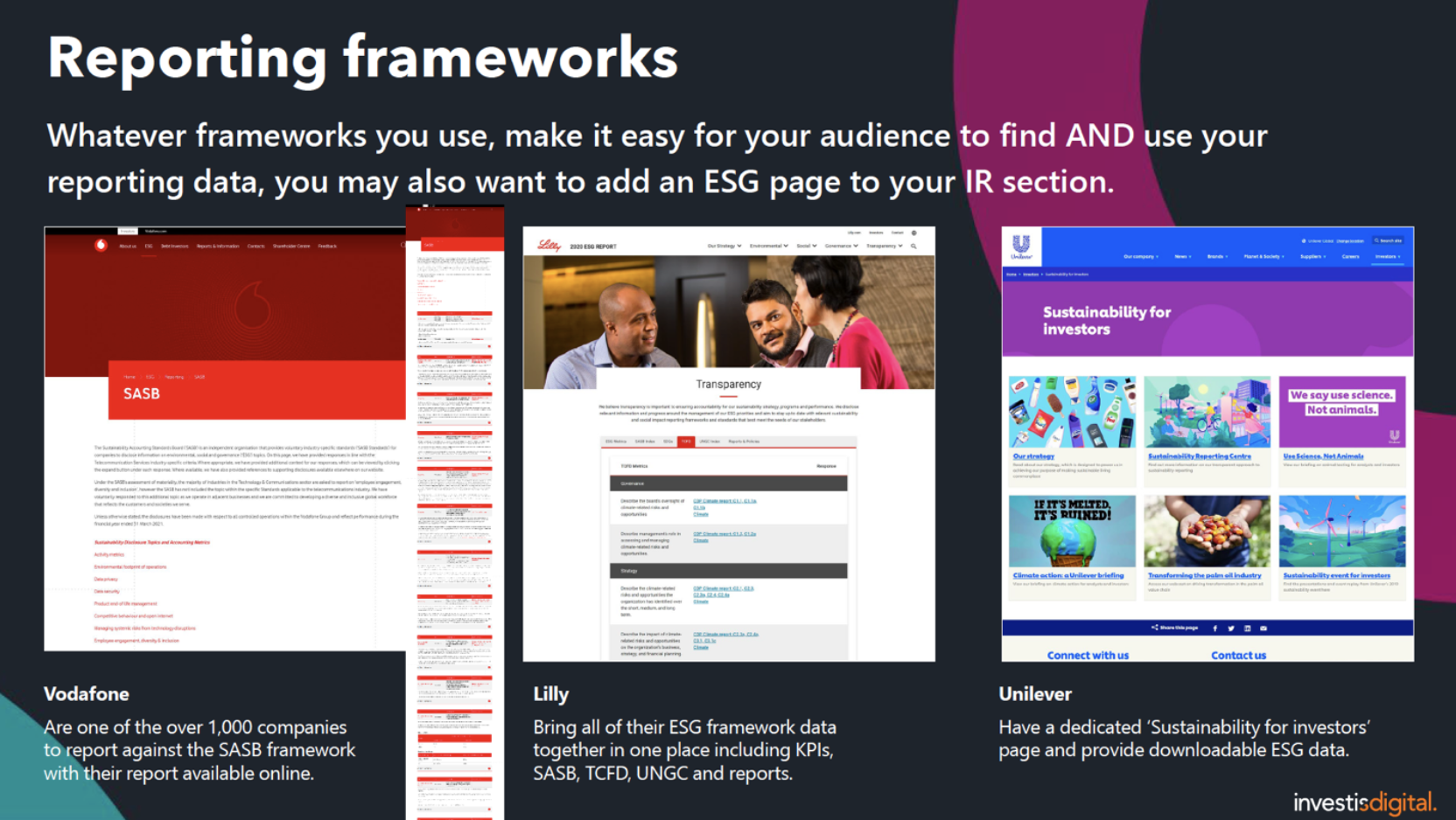 We’re also seeing an increasing number of companies adopting an ESG for investors page in their IR section to direct investors to key ESG content regardless of where that information resides on the website.