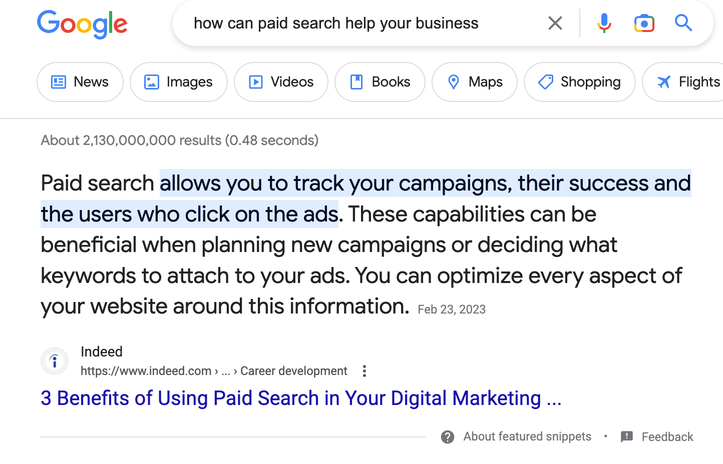 This could diversify the complexity of the SERP and turn attention away from both paid and organic listings. However, this is nothing new as zero click searches have been on the rise for years through the inclusion of featured snippets and answer boxes scattered throughout the SERP. (see screenshot below).