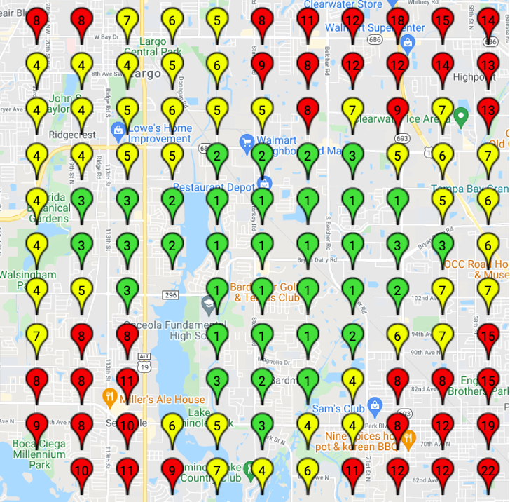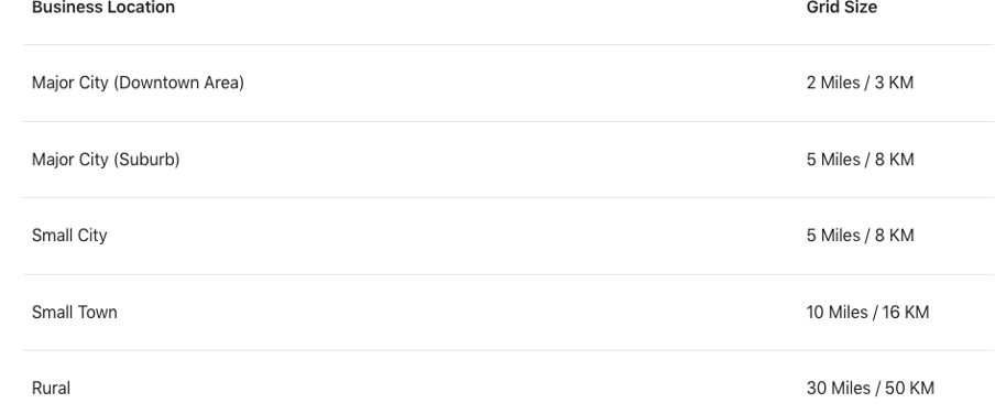 Places Scout lets you choose how large of a radius you would like to scout. If you are searching for rankings within a dense city, a smaller radius will give you more accurate results. We have found the following radiuses works best, depending on where your business is located: