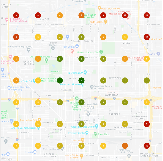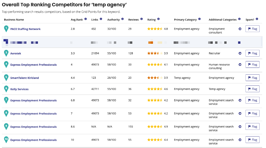 Places Scout allows you to select a grid layout ranging from 3x3 to 11x11. Each point on the grid will show you how your website or Google Business Profile ranks for your chosen keyword. In addition to viewing the rankings as a grid, the tool makes it easy to export this keyword data to custom reports.