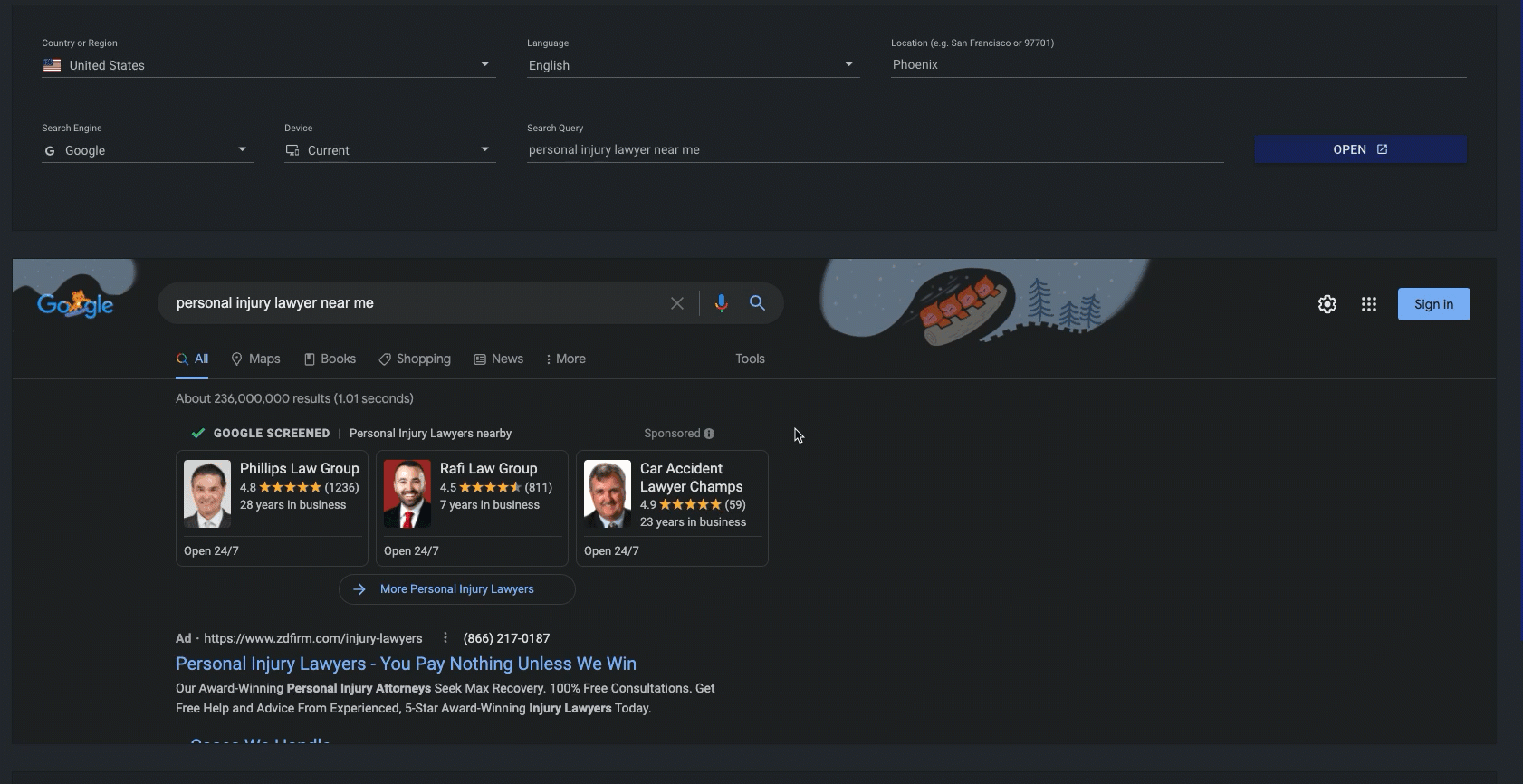 The free-to-use Local Search Results Tool offered by Merkle allows you to spoof your location to see what SERPs look like within a specific city or ZIP code. This is a great way to perform one-off local searches without having to rely on a subscription-based tool.