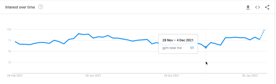 For example, say you have a new client in the gym and fitness industry. Over the last few months, the client has seen continual dips in site traffic. By looking at the "gym near me" keyword in Google Trends, you can see that the search interest started dropping around the beginning of June and did not start to rise again until the end of November (suspiciously, right after Thanksgiving).