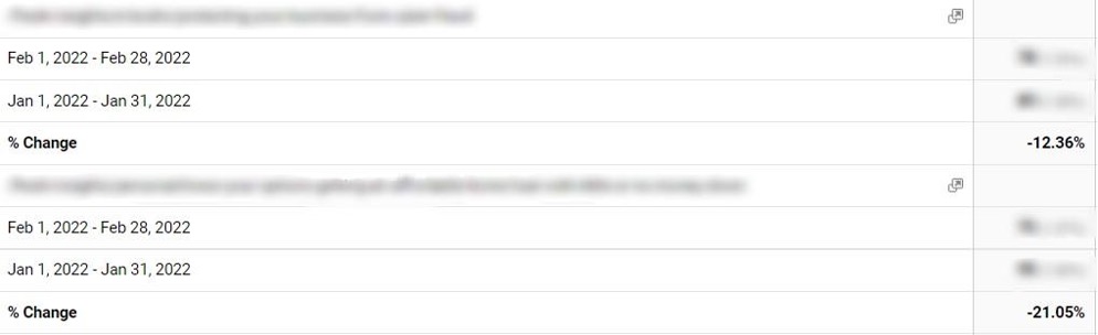 When looking for blog posts to refresh, pay special attention to any posts that used to be performing well, but are now experiencing a decline in traffic. A good way to identify this phenomenon is to use Google Analytics to compare traffic between two time periods (e.g., month over month or quarter over quarter). The “% Change” row in Google Analytics will show you how much traffic has increased or declined over that time period.