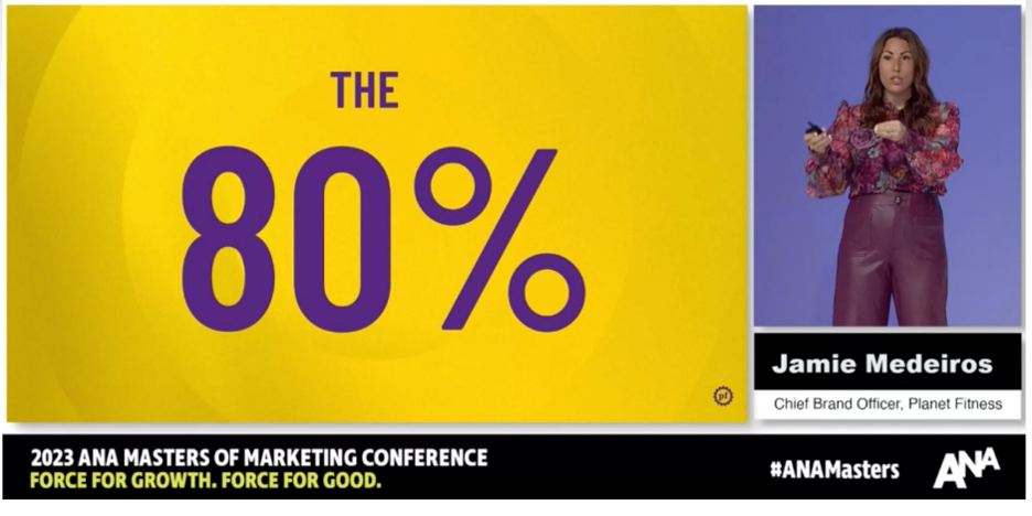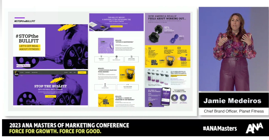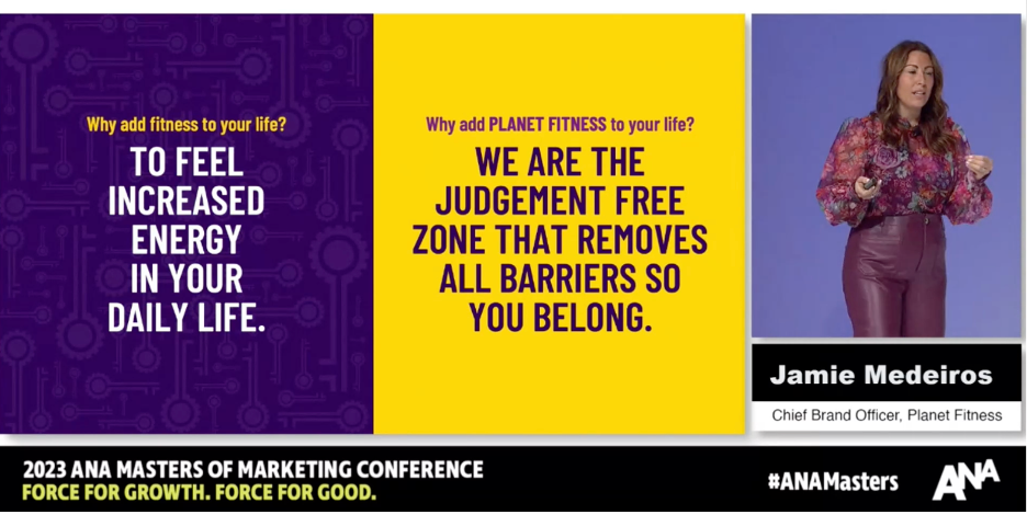 Delivering a powerful message sometimes means owning your customers’ pain points. That’s a big lesson I learned from Planet Fitness’s presentation at the 2023 ANA Masters of Marketing conference, delivered by Planet Fitness Chief Brand Officer Jamie Medeiros and Katy Hornaday, chief creative officer of Planet Fitness’s agency partner Barkley.