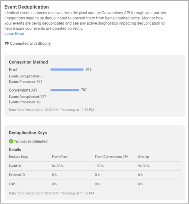 Facebook also uses unique user identifiers to dedupe the pixel and conversion API data. This prevents events from being counted twice.