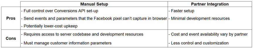 After you’ve secured buy-in from key stakeholders, there are two options to consider for installing Conversions API. You or your developer can connect the API manually with code or automatically through a partner integration.