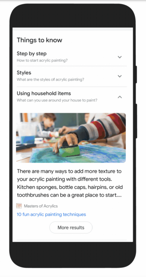 Google also announced something else that highlights the importance of visual content. A new Things to Know feature in Google Search will make it easier to explore new topics. Senior Vice President Prabhakar Raghavan wrote, “Let’s say you want to decorate your apartment, and you’re interested in learning more about creating acrylic paintings. If you search for ‘acrylic painting,’ Google understands how people typically explore this topic, and shows the aspects people are likely to look at first. For example, we can identify more than 350 topics related to acrylic painting, and help you find the right path to take.” The example cited made it clear that visual content would pop in those results: