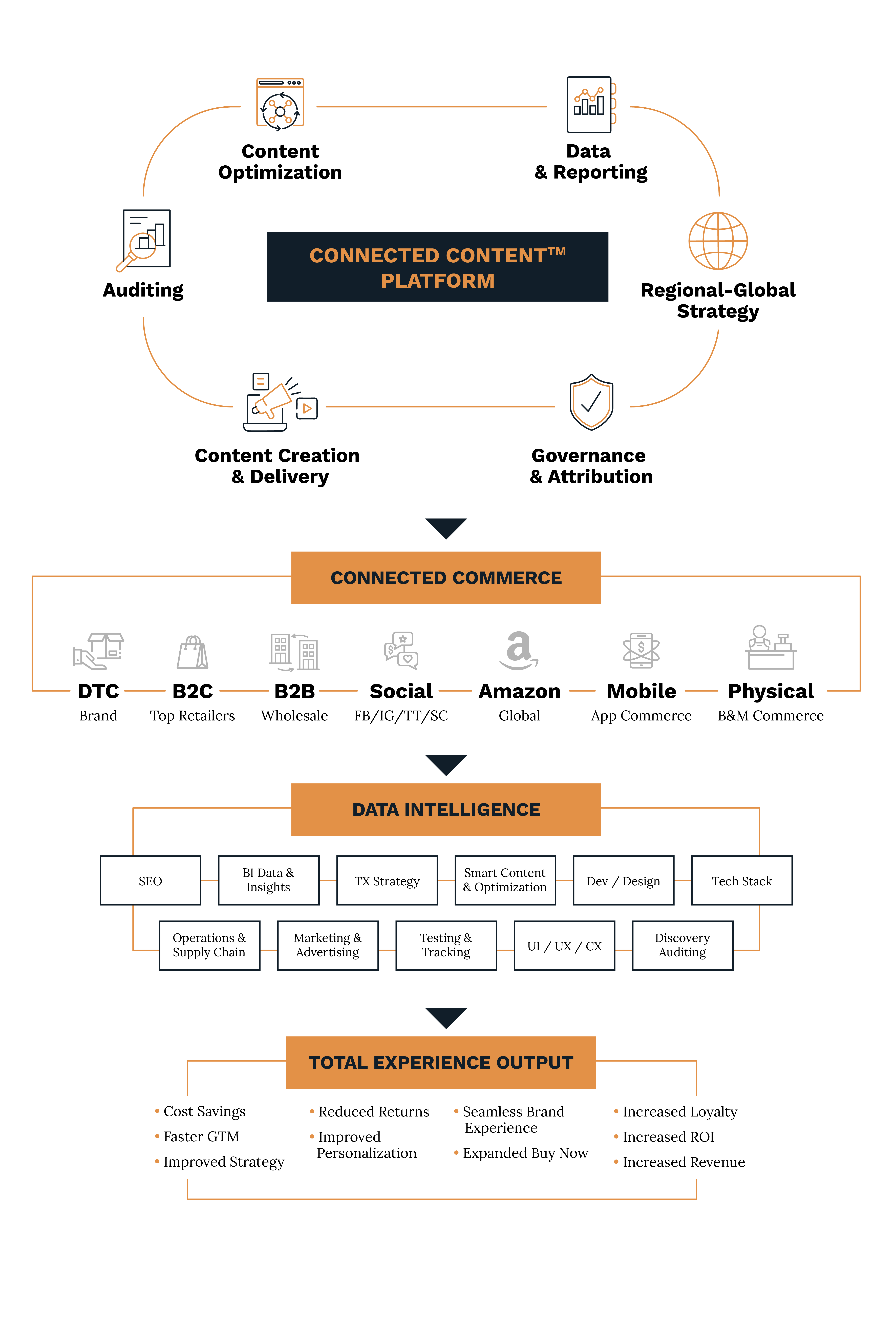 By bundling your existing vendors into a single commerce partner through Connected Content, enterprise brands can expect more efficient and effective plans of action to achieve their organizational goals, all while lowering costs.